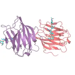 - ↑ Lobsanov YD, Gitt MA, Leffler H, Barondes SH, Rini JM (December 1993). "X-ray crystal structure of the human dimeric S-Lac lectin, L-14-II, in complex with lactose at 2.9-A resolution". The Journal of Biological Chemistry. 268 (36): 27034–8. doi:10.2210/pdb1hlc/pdb. PMID 8262940. S2CID 44347534.