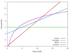 A Gap penalty is a method of scoring alignments of two or more sequences. When aligning sequences, introducing gaps in the sequences can allow an alignment algorithm to match more terms than a gap-less alignment can. However, minimizing gaps in an alignment is important to create a useful alignment. Too many gaps can cause an alignment to become meaningless. Gap penalties are used to adjust alignment scores based on the number and length of gaps. The five main types of gap penalties are constant, linear, affine, convex, and profile-based.[1]
