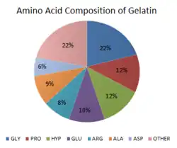 When dry, gelatin consists of 98–99% protein, but it is not a nutritionally complete protein since it is missing tryptophan and is deficient in isoleucine, threonine, and methionine.[12] The amino acid content of hydrolyzed collagen is the same as collagen. Hydrolyzed collagen contains 19 amino acids, predominantly glycine (Gly) 26–34%, proline (Pro) 10–18%, and hydroxyproline (Hyp) 7–15%, which together represent around 50% of the total amino acid content.[13] Glycine is responsible for close packing of the chains. Presence of proline restricts the conformation. This is important for gelation properties of gelatin.[14] Other amino acids that contribute highly include: alanine (Ala) 8–11%; arginine (Arg) 8–9%; aspartic acid (Asp) 6–7%; and glutamic acid (Glu) 10–12%.[13]