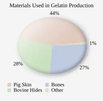 In 2019, the worldwide demand of gelatin was about 620,000 tonnes (1.4×109 lb).[25] On a commercial scale, gelatin is made from by-products of the meat and leather industries. Most gelatin is derived from pork skins, pork and cattle bones, or split cattle hides.[26] Gelatin made from fish by-products avoids some of the religious objections to gelatin consumption.[7] The raw materials are prepared by different curing, acid, and alkali processes that are employed to extract the dried collagen hydrolysate. These processes may take several weeks, and differences in such processes have great effects on the properties of the final gelatin products.