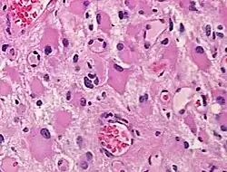 Gemistocytes are also found in some chronic diseases and within certain brain tumors, which suggests the presence of a long-lasting pathological reaction.[7] Gemistocytic astrocytes can be observed in tissue damage, particularly Creutzefldt-Jakob disease and progressive multifocal leukoencephalopathy, which can be characterized by very large gemistocytic astrocytes.[8] In the context of cancer (gemistocytic astrocytomas), gemistocytes are known to de-differentiate to a high grade (III or IV) glioma (i.e. glioblastoma multiforme) at a rapid pace, usually indicative of a poor prognosis.
