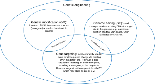 The relationship between gene targeting, gene editing and genetic modification is outlined in the Venn diagram below. It displays how 'Genetic engineering' encompasses all 3 of these techniques. Genome editing is characterised by making small edits to the genome at a specific location, often following cutting of the target DNA region by a site-specific-nuclease such as CRISPR.[12] Genetic modification usually describes the insertion of a transgene (foreign DNA, i.e. a gene from another species) into a random location within the genome.[13][14] Gene-targeting is a specific biotechnological tool that can lead to small changes to the genome at a specific site[2] - in which case the edits caused by gene-targeting would count as genome editing. However gene targeting is also capable of inserting entire genes (such as transgenes) at the target site if the transgene is incorporated into the homology repair template that is used during gene-targeting.[15][16] In such cases the edits caused by gene-targeting would, in some jurisdictions, be considered as equivalent to Genetic Modification as insertion of foreign DNA has occurred.[16]