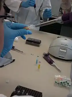 The next step is to isolate the candidate gene. The cell containing the gene is opened and the DNA is purified.[54] The gene is separated by using restriction enzymes to cut the DNA into fragments[55] or polymerase chain reaction (PCR) to amplify up the gene segment.[56] These segments can then be extracted through gel electrophoresis. If the chosen gene or the donor organism's genome has been well studied it may already be accessible from a genetic library. If the DNA sequence is known, but no copies of the gene are available, it can also be artificially synthesised.[57] Once isolated the gene is ligated into a plasmid that is then inserted into a bacterium. The plasmid is replicated when the bacteria divide, ensuring unlimited copies of the gene are available.[58] The RK2 plasmid is notable for its ability to replicate in a wide variety of single-celled organisms, which makes it suitable as a genetic engineering tool.[59]