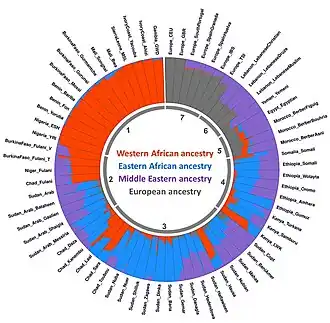 - ↑ Kulichova I, et al. (2017). "Internal diversification of non-Sub-Saharan haplogroups in Sahelian populations and the spread of pastoralism beyond the Sahara". American Journal of Biological Anthropology. 164 (2): 424–434. doi:10.1002/ajpa.23285. PMID 28736914.