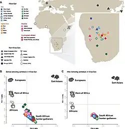 - 1 2 3 Skoglund P, Thompson JC, Prendergast ME, Mittnik A, Sirak K, Hajdinjak M, et al. (September 2017). "Reconstructing Prehistoric African Population Structure". Cell. 171 (1): 59–71.e21. doi:10.1016/j.cell.2017.08.049. PMC 5679310. PMID 28938123.