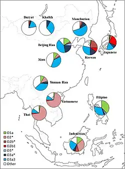 - ↑ Kim, Soon-Hee; et al. (2011). "High frequencies of Y-chromosome haplogroup O2b-SRY465 lineages in Korea: a genetic perspective on the peopling of Korea". Investigative Genetics. 2 (1): 10. doi:10.1186/2041-2223-2-10. PMC 3087676. PMID 21463511.