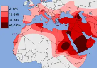 Haplogroup J-P209 is found in greatest concentration in Southwestern Arabian Peninsula. haplogroup J-P209 has a significant presence in North Africa, being the second most frequent haplogroup in the Maghreb. A study from 2021 has shown that the highest frequency of the Middle Eastern component ever observed in North Africa so far was observed in the Arabs of Wesletia in Tunisia, who had a Middle Eastern component frequency of 71.8%.[42] J-P209 has been found in frequencies of 35% in Algeria, 34% in Tunisia[43][44] and 20% in Egypt (Semino et al. 2004). In Morocco, J-M267 has been found in frequencies of 26.4%,[45] 31.5%,[46] and 20.4%.[47]
