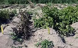 Genetically modified King Edward potato (right) next to King Edward which has not been genetically modified (left). Research field belonging to the Swedish University of Agricultural Sciences in 2019.