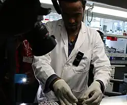 A geneticist is a biologist or physician who studies genetics, the science of genes, heredity, and variation of organisms.[1] A geneticist can be employed as a scientist or a lecturer. Geneticists may perform general research on genetic processes or develop genetic technologies to aid in the pharmaceutical or and agriculture industries.[1] Some geneticists perform experiments in model organisms such as Drosophila, C. elegans, zebrafish, rodents or humans and analyze data to interpret the inheritance of biological traits. A basic science geneticist is a scientist who usually has earned a PhD in genetics and undertakes research and/or lectures in the field. A medical geneticist is a physician who has been trained in medical genetics as a specialization and evaluates, diagnoses, and manages patients with hereditary conditions or congenital malformations; and provides genetic risk calculations and mutation analysis.