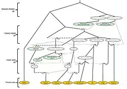 It has been found that the ancestral node of the phylogenetic tree of all the mtDNA types (mitochondrial DNA haplogroups) typically found in Central Asia, the West Asia and Europe are also to be found in South Asia at relatively high frequencies. The inferred divergence of this common ancestral node is estimated to have occurred slightly less than 50,000 years ago.[38] In India, the major maternal lineages are various M subclades, followed by R and U sublineages. These mitochondrial haplogroups' coalescence times have been approximated to date to 50,000 BP.[38]