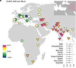32. 1 2 Moorjani P, Thangaraj K, Patterson N, Lipson M, Loh PR, Govindaraj P, et al. (September 2013). "Genetic evidence for recent population mixture in India". American Journal of Human Genetics. 93 (3): 422–438. doi:10.1016/j.ajhg.2013.07.006. PMC 3769933. PMID 23932107.
