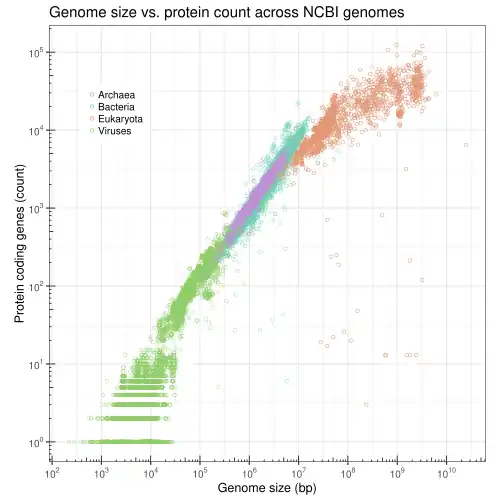 DNA sequences that carry the instructions to make proteins are referred to as coding sequences. The proportion of the genome occupied by coding sequences varies widely. A larger genome does not necessarily contain more genes, and the proportion of non-repetitive DNA decreases along with increasing genome size in complex eukaryotes.[31]