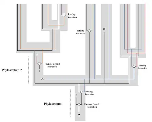 This technique relies on the assumption that the diversity of the genome is not only due to gene duplications but also to continuous frequent de novo gene births. These genes (called "founder genes") would form from non-genic DNA sequences, as well as from changes in reading frame (or other ways of arising from within existing genes), or even from very rapid evolution of the protein that would modify the sequence beyond recognition.[3] These new genes would at first have high evolutionary rates that would then slow down with time, allowing us to recognise their lineage in their descendants.[1] The founder genes can then be put in a specific phylostratum. The phylostratum is represented as the clade that includes all the genes that derive from the same founder gene, signifying that this gene was formed in the common ancestor of this clade (e.g. Arthropoda, Mammalia, Metazoa, etc.). Positioning these founder genes and their descendants on different phylostrata can allow us to age them. This can then be used to analyse the origin of certain functions of proteins and developmental processes on a macroevolutionary scale, by observing connections between certain genes as well.