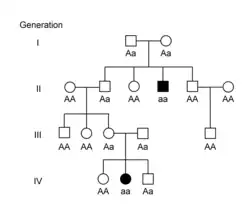Other conditions are inherited in an autosomal recessive pattern, where affected individuals do not typically have an affected parent. Since each parent must have a copy of the recessive allele in order to have an affected offspring, the parents are referred to as carriers of the condition.[11][12][13] In autosomal conditions, the sex of the offspring does not play a role in their risk of being affected. In sex-linked conditions, the sex of the offspring affects their chances of having the condition. In humans, females inherit two X chromosomes, one from each parent, while males inherit an X chromosome from their mother and a Y chromosome from their father. X-linked dominant conditions can be distinguished from autosomal dominant conditions in pedigrees by the lack of transmission from fathers to sons, since affected fathers only pass their X chromosome to their daughters.[13][11][14] In X-linked recessive conditions, males are typically affected more commonly because they are hemizygous, with only one X chromosome. In females, the presence of a second X chromosome will prevent the condition from appearing. Females are therefore carriers of the condition and can pass the trait on to their sons.[13][11][14]