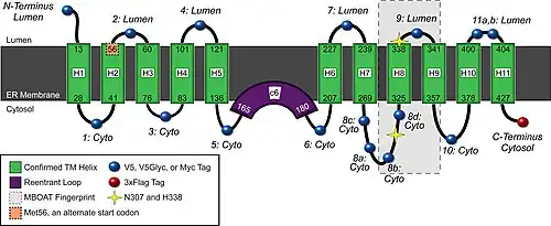 The structure of ghrelin O-acyltransferase has not been fully elucidated or tested experimentally. Using biochemical mapping tools, researchers showed that the ghrelin O-acyltransferase enzyme consists of eleven transmembrane helical domains and one reentrant loop.[7] The C-terminus of ghrelin O-acyltransferase is located on the cytosolic side of the endoplasmic reticulum (ER) while the N-terminus resides in the lumen of the membrane. The topology models of ghrelin O-acyltransferase are similar to those of acetyl-coenzyme A acetyltransferase 1 and glycerol uptake protein 1. This is consistent with ghrelin O-acyltransferase being a member of the membrane bound O-acyl transferase family.
