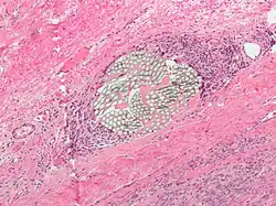 Foreign-body giant cells form when a subject is exposed to a foreign substance. Exogenous substances can include talc or sutures. As with other types of giant cells, epithelioid macrophages fusing together causes these giant cells to form and grow.[13] In this form of giant cell, the nuclei are arranged in an overlapping manner. This giant cell is often found in tissue because of medical devices, prostheses, and biomaterials.