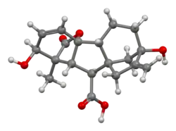 Plants in their normal state produce large amounts of GA3. It is possible to produce the hormone industrially using microorganisms.[2] Gibberellic acid is a simple gibberellin, a pentacyclic diterpene acid promoting growth and elongation of cells. It affects decomposition of plants and helps plants grow if used in small amounts, but eventually plants develop tolerance to it. GA stimulates the cells of germinating seeds to produce mRNA molecules that code for hydrolytic enzymes. Gibberellic acid is a very potent hormone whose natural occurrence in plants controls their development. Since GA regulates growth, applications of very low concentrations can have a profound effect while too much will have the opposite effect.[3] It is usually used in concentrations between 0.01 and 10 mg/L.