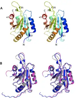 Stereo ribbon diagram of the crystal structure of GMFG. Spectral coloring is from blue (N-terminus) to red (C-terminus). Secondary structural elements are indicated