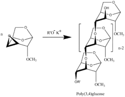 Polymerization of 3,4-epoxy levoglucosan (1,6;3,4-dianhydro-2-O-alkyl-β-D-galactopyranose) results in formation 3,4-bounded levoglucosan polymer.[11]