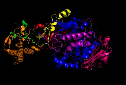 Glucansucrase has five major domains: A, B, C, IV, and V. The domains in glucansucrase, however, have a different arrangement than those in α-amylase. The folding characteristics of α-amylase and glucansucrase are still very similar, but their domains are permuted.[5][6][3] Domains A, B, IV, and V are built from two discontiguous parts of the polypeptide chain, causing the chain to follow a U-shape.[1] From the N- to C-terminus, the polypeptide chain goes in the following order: V, IV, B, A, C, A, B, IV, V (see figure at top right).[4] The C domain is the only one made up of a continuous polypeptide sequence.