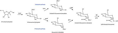 - ↑ Milewski S, Gabriel I, Olchowy J (January 2006). "Enzymes of UDP-GlcNAc biosynthesis in yeast". Yeast. 23 (1): 1–14. doi:10.1002/yea.1337. PMID 16408321. S2CID 39940329.