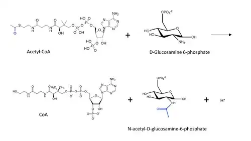 The general reaction mechanism postulated for protein N-end acetylation (inspired by lysine acetylation mechanism) with Acetyl-CoA involves a nucleophilic attack of the amino group (in this case from D-Glucosamine-6-phosphate) on the terminal carbonyl in the carbon transfer, leading to the formation of a carbon tetrahedral intermediate.[13] The reaction proceeds with the restoration of the carbonyl by removing the CoA as a leaving group, such that now the acetyl group is connected to the amino group in the other substrate.
