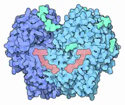 The glucose oxidase enzyme (GOx or GOD) also known as notatin (EC number 1.1.3.4) is an oxidoreductase that catalyses the oxidation of glucose to hydrogen peroxide and D-glucono-δ-lactone. This enzyme is produced by certain species of fungi and insects and displays antibacterial activity when oxygen and glucose are present.[2]