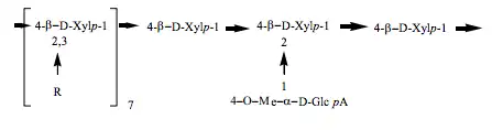 Glucuronoxylans are the primary components of hemicellulose as found in hardwood trees, for example birch.[1] They are hemicellulosic plant cell wall polysaccharides, containing glucuronic acid and xylose as its main constituents. They are linear polymers of β-D-xylopyranosyl units linked by (1→4) glycosidic bonds, with many of the xylose units substituted with 2, 3 or 2,3-linked glucuronate residue, which are often methylated at position 4. Most of the glucuronoxylans have single 4-O-methyl-α-D-glucopyranosyl uronate residues (MeGlcA) attached at position 2. This structural type is usually named as 4-O-methyl-D-glucurono-D-xylan (MGX).