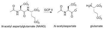 GCPII has been shown to both indirectly and directly increase the concentration of glutamate in the extracellular space.[37] GCPII directly cleaves NAAG into NAA and glutamate.[7][8] NAAG has been shown, in high concentration, to indirectly inhibit the release of neurotransmitters, such as GABA and glutamate. It does this through interaction with and activation of presynaptic group II mGluRs.[37] Thus, in the presence of NAAG peptidase, the concentration of NAAG is kept in check, and glutamate and GABA, among other neurotransmitters, are not inhibited.