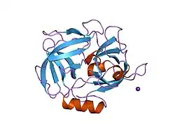 - ↑ Filipek R, Rzychon M, Oleksy A, Gruca M, Dubin A, Potempa J, Bochtler M (October 2003). "The Staphostatin-staphopain complex: a forward binding inhibitor in complex with its target cysteine protease". The Journal of Biological Chemistry. 278 (42): 40959–40966. doi:10.1074/jbc.M302926200. PMID 12874290.