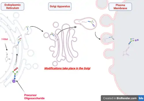 The exact mechanism of GlycoRNA glycosylation is still unclear. It remains ambiguous whether it follows a similar process performed by glycolipids and glycoproteins in the ER-Golgi complex or through different machinery. Flynn and Bertozzi have offered the first description of glycoRNA, and suggest that RNAs are glycosylated using the same machinery and mechanism that produces N- and O-linked glycans in glycosylated proteins.