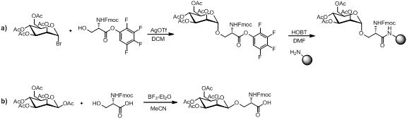 Within solid phase peptide synthesis (SPPS) there exist two strategies for the synthesis of glycopeptides, linear and convergent assembly. Linear assembly relies on the synthesis of building blocks and then the use of SPPS to attach the building block together. An outline of this approach is illustrated below.