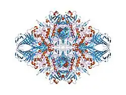 - 1 2 3 Jacobson RH, Zhang XJ, DuBose RF, Matthews BW (June 1994). "Three-dimensional structure of beta-galactosidase from E. coli". Nature. 369 (6483): 761–6. Bibcode:1994Natur.369..761J. doi:10.1038/369761a0. PMID 8008071. S2CID 4241867.