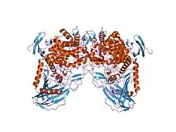 It consists of three structural domains. The C-terminal domain forms a two layered jelly roll motif. This domain is situated at the base of the catalytic domain, however its function remains unknown.[8] The central domain is the catalytic domain, which binds a phosphate ion that is proximal the highly conserved Glu. The arrangement of the phosphate and the glutamate is thought to cause nucleophilic attack on the anomeric carbon atom.[8] The catalytic domain also forms the majority of the dimerisation interface. The N-terminal domain is believed to be essential for catalytic activity[8] although its precise function remains unknown.