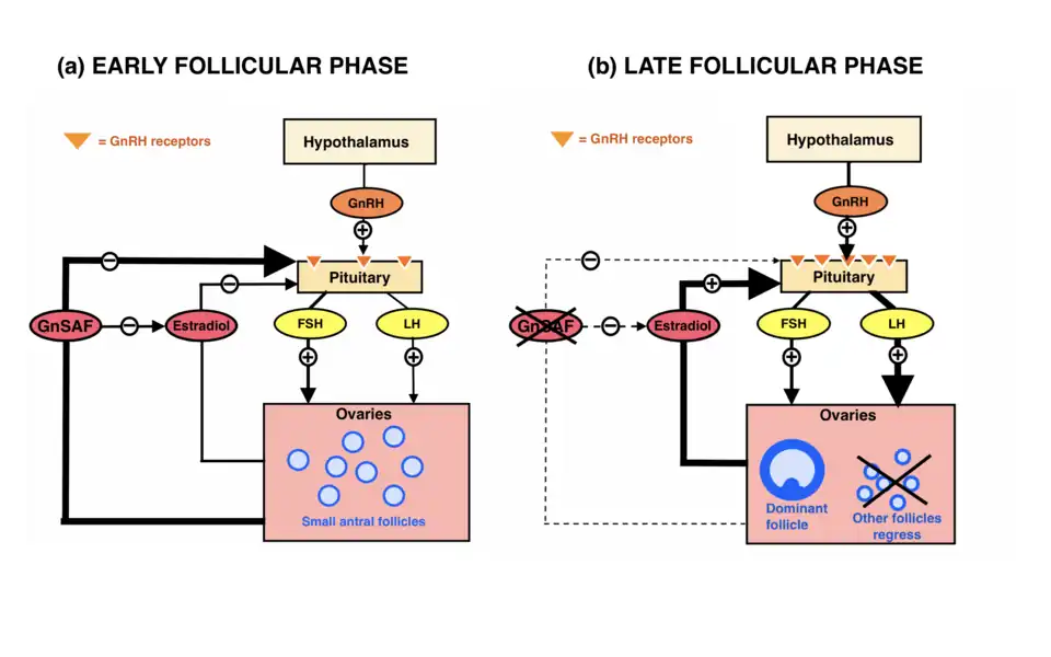 Towards the end of the follicular phase, GnSAF bioactivity is at its lowest due to the absence of small antral follicles.[1] Estradiol secretion from the dominant follicle exponentially increases and exceeds a threshold which switches estradiol feedback on GnRH pulse frequency from negative to positive.[12][15] Pituitary sensitivity to GnRH is restored.[2][4]