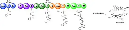 Second enzyme cluster GrsB contains four modules, each containing condensation (C), adenylation (A), and thiolation (T) domains and thioesterase domain (TE) at the end. C domain forms a peptide bond between two amino acids, D-Phe and L-Pro. L-Val, L-Orn, and L-Leu are incorporated sequentially by the next three modules of GrsB. After repeating the whole module synthesis once again, TE domain cyclizes and releases the two peptides and dimerize them together to form the final product.[7]