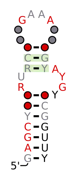 Group II introns are a large class of self-catalytic ribozymes and mobile genetic elements found within the genes of all three domains of life. Ribozyme activity (e.g., self-splicing) can occur under high-salt conditions in vitro. However, assistance from proteins is required for in vivo splicing.[1] In contrast to group I introns, intron excision occurs in the absence of GTP and involves the formation of a lariat, with an A-residue branchpoint strongly resembling that found in lariats formed during splicing of nuclear pre-mRNA. It is hypothesized that pre-mRNA splicing (see spliceosome) may have evolved from group II introns, due to the similar catalytic mechanism as well as the structural similarity of the Group II Domain V substructure to the U6/U2 extended snRNA.[2][3] Finally, their ability to site-specifically insert into DNA sites has been exploited as a tool for biotechnology.[4] For example, group II introns can be modified to make site-specific genome insertions and deliver cargo DNA such as reporter genes or lox sites [5]