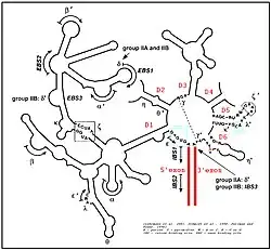 The secondary structure of group II introns is characterized by six typical stem-loop structures, also called domains I to VI (DI to DVI, or D1 to D6). The domains radiate from a central core that brings the 5' and 3' splice junctions into close proximity. The proximal helix structures of the six domains are connected by a few nucleotides in the central region (linker or joiner sequences). Due to its enormous size, the domain I was divided further into subdomains a, b, c, and d. Sequence differences of group II introns that led to a further division into subgroups IIA, IIB and IIC were identified, along with varying distance of the bulged adenosine in domain VI (the prospective branch point forming the lariat) from the 3' splice site, and the inclusion or omission of structural elements such as a coordination loop in domain I, which is present in IIB and IIC introns but not IIA.[1] Group II introns also form very complicated RNA Tertiary Structure.