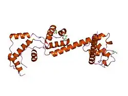 In molecular biology, the HAND domain is a protein domain which adopts a secondary structure consisting of four alpha helices, three of which (H2, H3, H4) form an L-like configuration. Helix H2 runs antiparallel to helices H3 and H4, packing closely against helix H4, whilst helix H1 reposes in the concave surface formed by these three helices and runs perpendicular to them. This domain confers DNA and nucleosome binding properties to the proteins in which it occurs.[1] It is named the HAND domain because its 4-helical structure resembles an open hand.