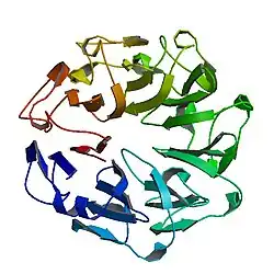 It has an N-terminal bilobed HECT domain, conferring E3 ligase functionality, as well as 3 RLD domains with seven-bladed β-propeller folds. In addition to these HERC family hallmarks, it has several other motifs; a cytochrome-b5-like domain, several potential phosphorylation sites, and a ZZ-type zinc finger motif.[5] This is likely involved in protein binding, and has recently been identified as a SUMOylation target following DNA damage.[13]