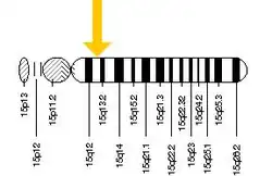 The full HERC2 gene is located at 15q13, encoded by 93 exons and its transcription is under the control of a CpG rich promoter. This region on chromosome 15 is susceptible to breaks during chromosomal rearrangement and there are at least 12 partial duplicates of HERC2 between 15q11–15q13.[10]