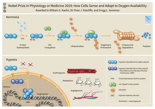 - ↑ Semenza GL (August 2004). "Hydroxylation of HIF-1: oxygen sensing at the molecular level". Physiology. 19 (4): 176–82. doi:10.1152/physiol.00001.2004. PMID 15304631. S2CID 2434206.
