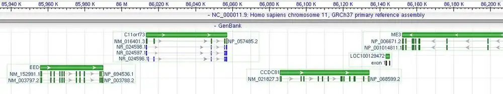 - ↑ NCBI Entrez https://www.ncbi.nlm.nih.gov/nuccore/NC_000011.9?from=86011067&to=86059171&report=graph