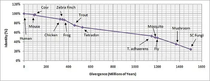 The graph shows the percent identity of the ortholog against the divergence time of the organism to produce a mostly linear curve. The two main joints within the curve suggest times of gene duplication, around 450 million years and 1150 million years ago respectively. The paralogs from the gene duplications are probably so dissimilar from the highly conserved orthologs of HIKESHI that it was not found using the Blink or BLAST tools.