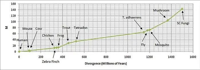 The evolutionary history of organisms can be determined using the sequences of orthologs as time references to create a phylogenetic tree. The CLUSTALW[21] compares multiple sequences, the program can also be used to create such a phylogenetic tree based on the orthologs of C11orf73. The tree to the right shows the generated phylogenetic tree with a time line based on time of divergence. The tree made from the HIKESHI orthologs is identical to the literature phylogenetic tree, even grouping together similar organisms such as fish, birds, and fungi.