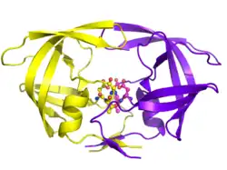 HIV-1 protease or PR is a retroviral aspartyl protease (retropepsin), an enzyme involved with peptide bond hydrolysis in retroviruses, that is essential for the life-cycle of HIV, the retrovirus that causes AIDS.[1][2] HIV-1 PR cleaves newly synthesized polyproteins (namely, Gag and Gag-Pol[3]) at nine cleavage sites to create the mature protein components of an HIV virion, the infectious form of a virus outside of the host cell.[4] Without effective HIV-1 PR, HIV virions remain uninfectious.[5][6]
