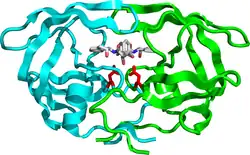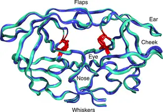 HIV-1 protease labelled according to its resemblance to an English Bulldog or a fat cat.[7] The blue and cyan-green ribbons depict the peptide backbone of a wild-type (1KZK) and a mutant (1D4S) structure, respectively.