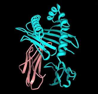 ![]() Rendering or 2hla showing A*6801 (cyan) and Beta-2 microglobulin (rose). There is no bound peptide in this image. | ||||||||||||||||