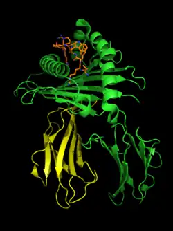 ![]() HLA-B*2705-peptide (chain A shown in green cartoon, chain B shown in yellow cartoon) complexed to a fragment of the influenza nucleoprotein NP383-391 (orange, sticks). PDB ID 2BST | ||