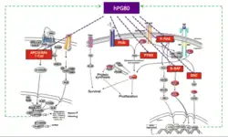 The oncogene pp60 (c-Src) is activated in colon cancer cells and leads to increased amounts of hPG80.[9] This means that hPG80 production, which occurs during early tumorigenesis, could play a role in this activation, which is known as an early event in colon tumorigenesis.[11][28][29] The PI3K/Akt pathway, which is particularly involved in proliferation, is also activated by hPG80. NF-kappaB is another important signaling messenger regulated by hPG80.[11][30] Its involvement in mechanisms responsible for the anti-apoptotic effect of hPG80 has been demonstrated in pancreatic cancer cells in vitro and in vivo in mice overexpressing the GAST gene.[31][32] JAK2 (Janus-activated kinase 2), STAT3 and kinases increases regulated by extracellular signals have also been observed in the colon mucosa of hGAS mice.[30]